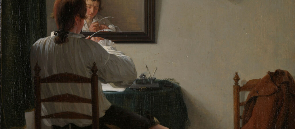 Włóczyłem się po pustych salach, przyglądałem cudacznym, zupełnie fantastycznym meblom (żarłocznej szafie, która zaraz pęknie z przejedzenia, szafie w wytwornym przebraniu świątyni greckiej, kredensowi-konfesjonałowi czy zegarowi udającemu Chińczyka). I wtedy Go zobaczyłem. Był w stosownym wieku, wyjątkowo wdzięczny i zgrabny, malutki, wielkości mniej więcej kartki formatu A4 (a dokładniej: 27,5 × 23,5 cm). Olej na desce w proporcjonalnej złoconej ramce, datowany na 1784 r. i zatytułowany Pisarz, który ostrzy swe pióro (Een schrijver die zijn pen versnijdt). Obraz, a raczej obrazek, namalował Jan Ekels młodszy. Starego Ekelsa znałem dosyć dobrze, nawet coś o nim kiedyś napisałem, ale młodszy zupełnie nic mi nie mówił (dopiero potem skojarzyłem go z Alegorią słuchu, która wisiała w eleganckim kanarkowym salonie mojego kolegi Charlesa w Hadze).